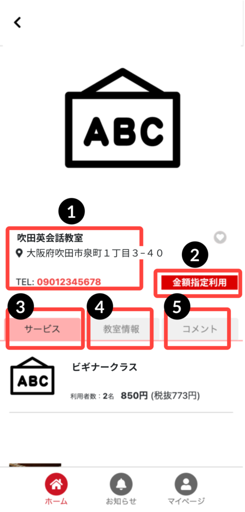 検索結果で表示された教室をクリックすると教室の詳細ページが表示されます。