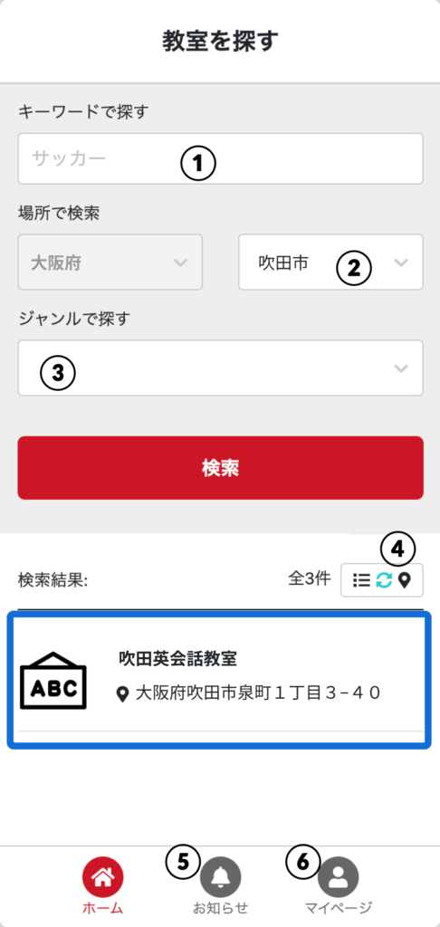 ① 探したい教室のキーワードを入力します。